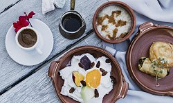 - Ποτά (Νερό, τσάι (ζεστό ή κρύο), αναψυκτικά, μπύρα, τοπικά κρασιά, ούζο, κονιάκ) και παγωτό κατά την διάρκεια του γεύματος και του δείπνου