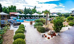 - Ξαπλώστρες και ομπρέλες στο χώρο της πισίνας