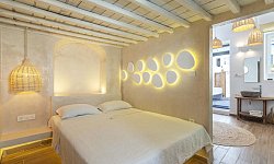 Όλες οι ολόασπρες σουίτες είναι χτισμένες σύμφωνα με την τοπική αρχιτεκτονική. Διαθέτουν χτιστά κρεβάτια, ξύλινη οροφή, κλινοσκεπάσματα Coco-Mat, δωρεάν WiFi, έξυπνη τηλεόραση με δορυφορικά κανάλια, βάση σύνδεσης για iPod, μπουρνούζια, παντόφλες και δωρεάν προϊόντα περιποίησης. Ορισμένες μονάδες έχουν επίσης μπανιέρα-υδρομασάζ ή υπαίθριο υδρομασάζ.