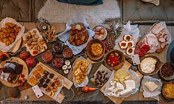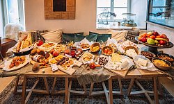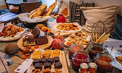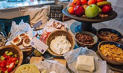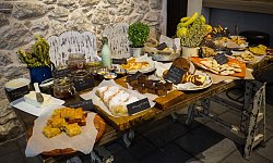 Το σπιτικό πρωινό, το φτιάχνουμε καθημερινά στον χώρο μας με προϊόντα παραγωγής μας. Από το παραδοσιακό, οικογενειακό τυροκομείο μας παίρνουμε το φρέσκο βούτυρο, γραβιέρα, φέτα, ανθότυρο, γιαούρτι, όλα με ντόπιο πρόβειο γάλα. Το ψωμί με προζύμι είναι φτιαγμένο από την αγαπητή πεθερούλα σε ξυλόφουρνο και τα αυγά από τις κότες της. Μέλι ντόπιο. Γλυκές πίτες πορτοκαλόπιτα, γαλατόπιτα, σοκολατόπιτα, μπουγάτσα, τηγανίτες, κέικ σοκολάτας – βανίλιας. Μπισκότα, κουλουράκια, κριτσίνια με καρότα και γραβιέρα. Αλμυρές πίτες τεμπελοτυρόπιτα, σπανακόπιτα, ομελέτα, τα φτιάχνουμε εγώ και οι κοπέλες που δουλεύουν στο ξενοδοχείο. Τις σπιτικές εποχιακές μαρμελάδες τις αναλαμβάνει και τις φτιάχνει η μαμά και οι θείες.