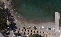 - Παραλία με βότσαλο και ξαπλώστρες με ομπρέλες