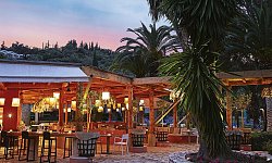 Στο εστιατόριο Marco Polo μπορείτε να απολαύσετε ελληνική και διεθνή κουζίνα για μεσημεριανό γεύμα ή δείπνο, ενώ το εστιατόριο Giardino di Mama δίπλα στην παραλία σερβίρει σπιτική πίτσα και φρέσκα ζυμαρικά. Οι επισκέπτες μπορούν επίσης να χαλαρώσουν με ένα δροσιστικό ποτό στο μπαρ Waterfall δίπλα στην πισίνα ή στο κομψά διακοσμημένο λόμπι.