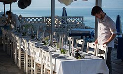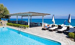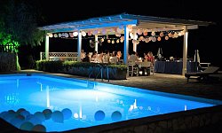 Μετά τη δύση του ηλίου, ο χώρος γύρω από την πισίνα και το εστιατόριο είναι ιδανικά για ένα ποτό σε χαλαρή ατμόσφαιρα και δείπνο με μουσική δίπλα στη θάλασσα.