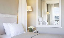 Τα δωμάτια του Mon Repos Palace προσφέρουν άνεση και πολυτέλεια σε κλασικές γραμμές και τόνους. Από τα περισσότερα μπορείτε να απολαύσετε πανοραμική θέα στο Ιόνιο ή το Παλαιό Φρούριο, ενώ η κοντινότερη παραλία βρίσκεται μόλις 20 μέτρα μακριά. Την εκλεκτή φιλοξενία, έρχεται να συμπληρώσει το εστιατόριο Passaggio Bistrot γνωστό για τις πλούσιες γεύσεις του, αλλά και για τις μουσικές βραδιές που έχουν αγαπηθεί από ντόπιους και επισκέπτες.