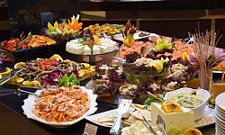 Τα 2 εστιατόρια και τα 2 μπαρ του Olympia Golden Beach σερβίρουν μεγάλη ποικιλία από ευρωπαϊκές και ελληνικές γεύσεις. Το ελληνικό πρωινό του καταλύματος παρασκευάζεται με φρέσκα, παραδοσιακά υλικά. Τα μπαρ λειτουργούν όλη την ημέρα, ενώ παρέχεται επίσης 24ωρη υπηρεσία δωματίου έως αργά το βράδυ.